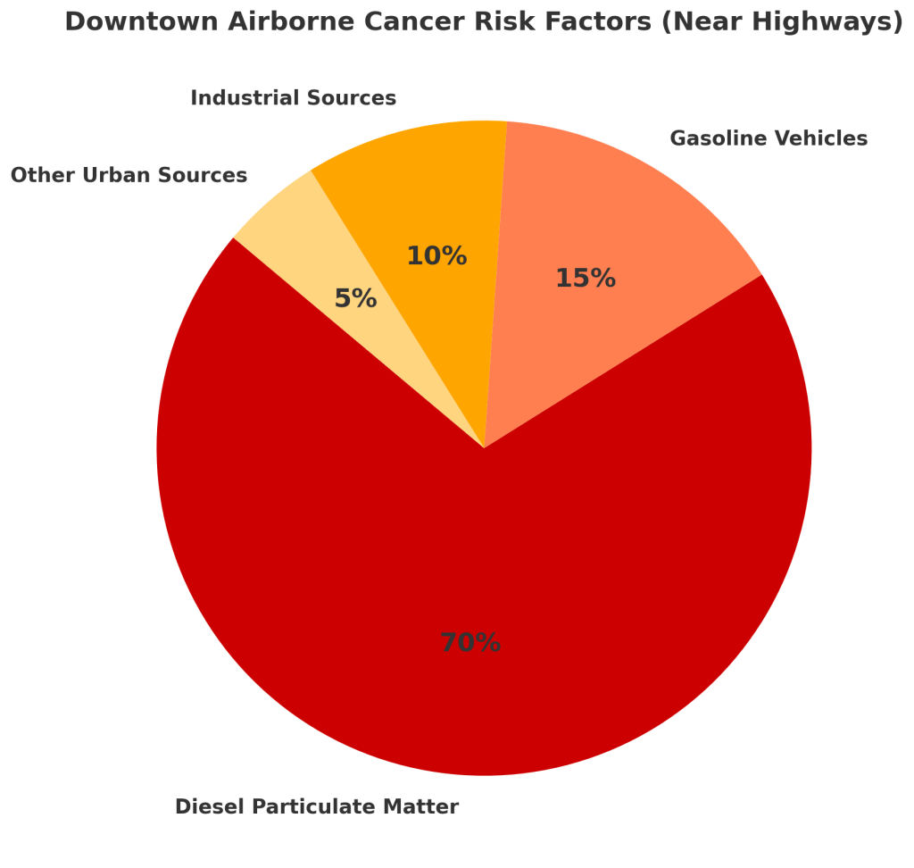 - Near heavily used highways, 70% of the airborne cancer risk from toxic air pollutants in 2000 was attributed to diesel particulate matter.