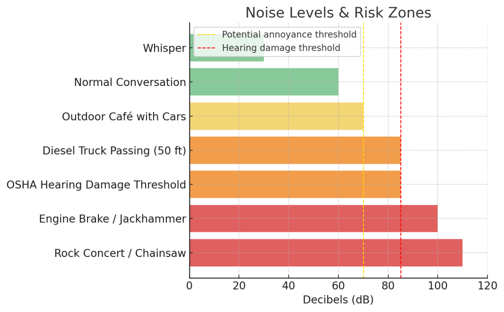Noise levels around 60–70 dB are enough to drown out conversation and strain outdoor seating areas, especially when punctuated with truck engine noise.