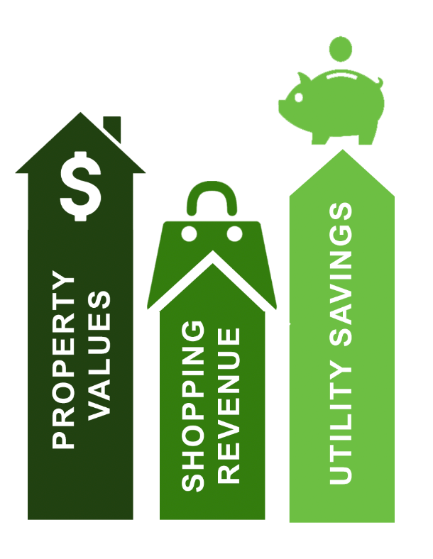 • Proximity to green, shaded areas boosts both residential and commercial property values by 7–25% according to research from the U.S. Forest Service and the National Recreation and Park Association.