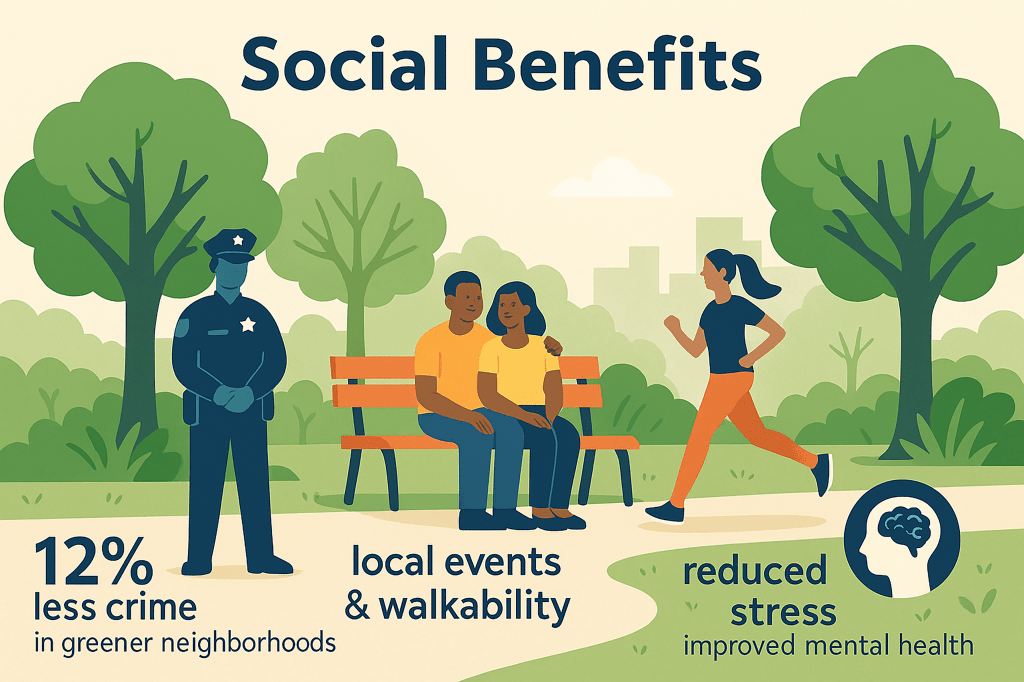 • Greener neighborhoods report up to 12% less crime, as well-maintained spaces encourage natural surveillance via community presence, according to research published in Environment and Behavior and supported by the U.S. Forest Service.