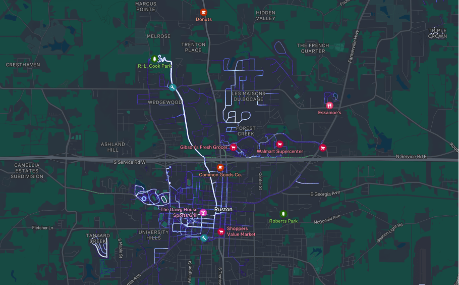 Strava walking paths heatmap of Ruston; the lighter the path, the more it is utilized. This map certainly demonstrates, “if you build it, they will come,” with the Rock Island Greenway showing the most use.