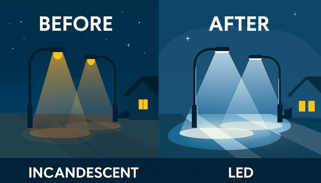 Most modern LED streetlights emit a cool-spectrum, bluish-white light. They look brighter but it come with tradeoffs: