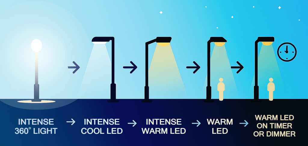 Progression from most light pollution-causing-lighting to least.
