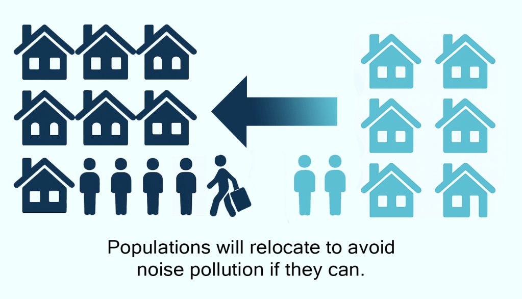 As intrusive noise levels rise, residents with the resources to relocate often move farther out of town, eroding the local tax base and shifting neighborhood dynamics. This leads to more transitional renters who, though not inherently disengaged, tend to have fewer reasons or opportunities to invest long-term in the area.
