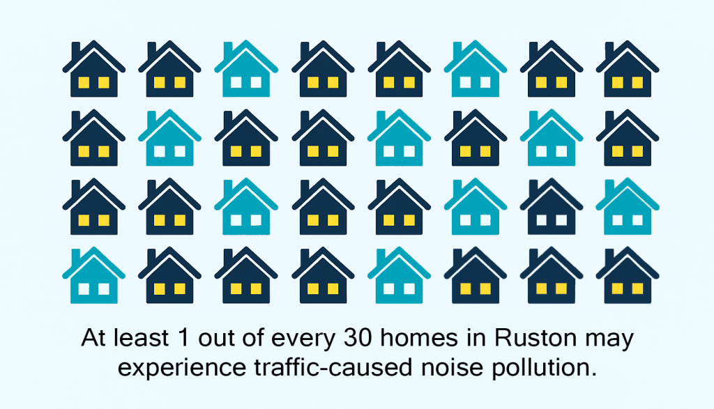 Without significant elevation changes or natural barriers to block noise, diverting it is a big challenge. According to the Federal Highway Administration, achieving a 50% reduction in noise requires a combination of elevated earth berms, dense evergreen buffers, and sound-dampening surfaces, none of which currently exist in Ruston at scale.