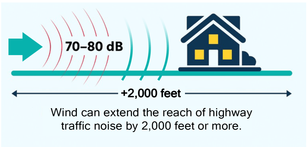 Noise travels horizontally outward from its source. Think of a traffic lane as the mouth of a megaphone, radiating out horizontally in all directions. Over flat land, especially with hard surfaces like pavement or bare ground, there is little natural absorption. Noise stays low and travels farther, rather than dissipating.